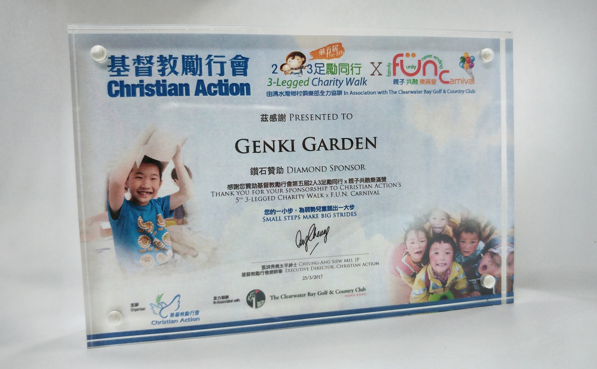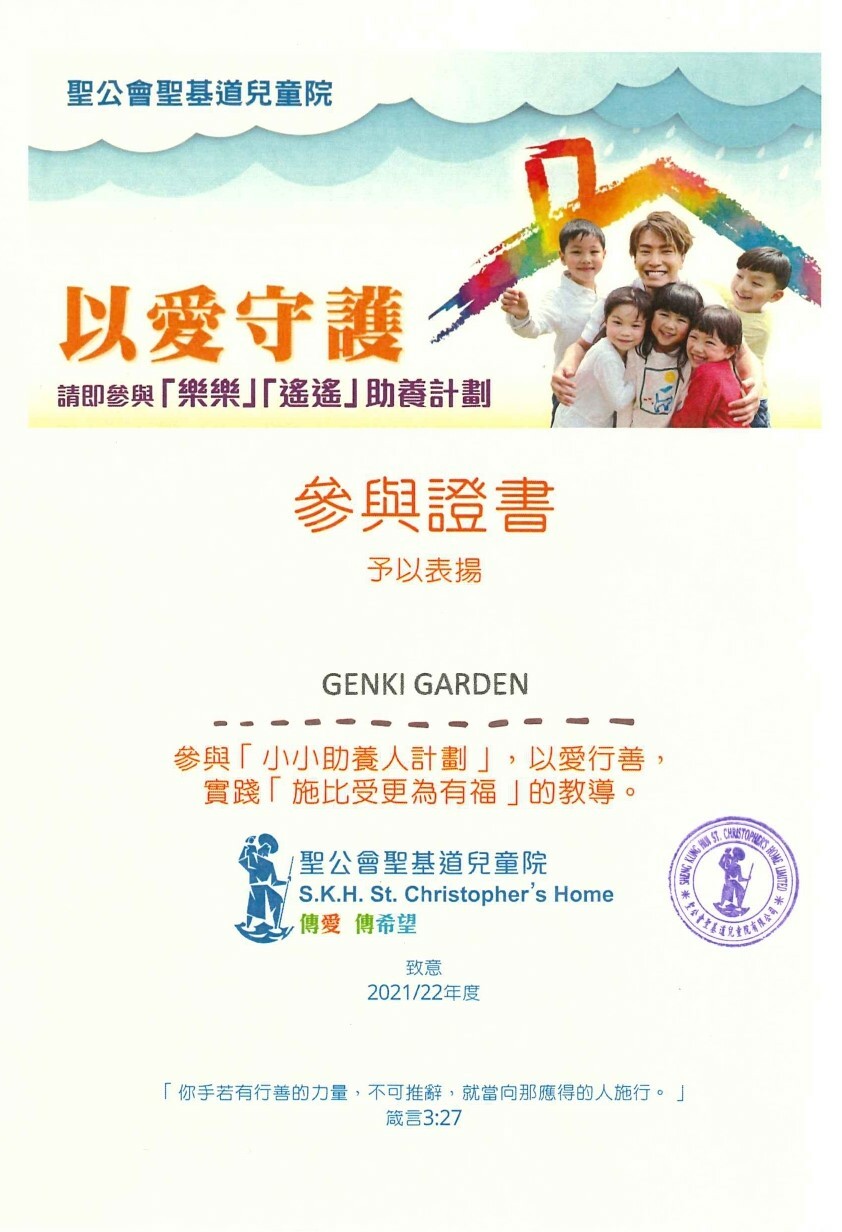 Genki Garden一直關懷社會,熱心公益。在過去幾年,我們參與不同慈善機構舉辦的活動,希望令更多有需要人士受惠。最近,我們獲得聖公會基道兒童院「小小助養人計劃」贈予的感謝證書。我們很高興能參與其中,付出一分力,履行社會責任,回饋社會。